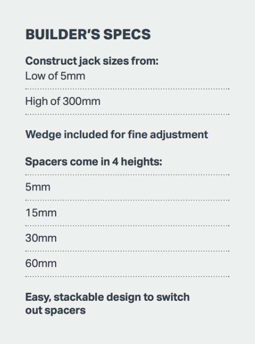 Projack is a low-cost, stackable deck jack with interchangeable spacers, so it’s easier to quantify the heights you need. It can support timber and Proframe aluminium joist and bearers for a strong decking support solution.